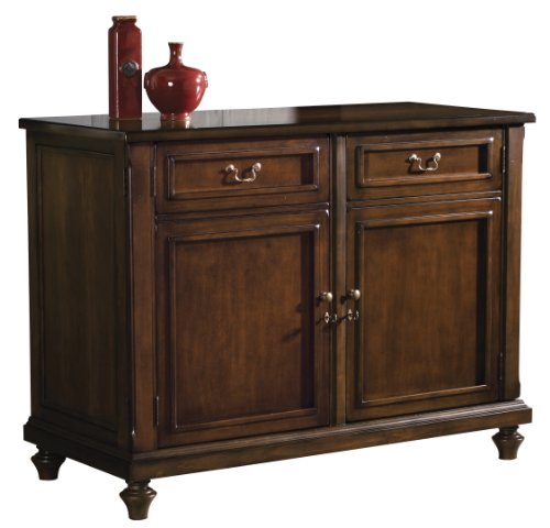 The Verona Wine & Bar Console by Howard Miller is finished in Americana Cherry on select hardwoods and veneers, with light distressing and worn edges and corners. Antique finish on all hardware. This buffet combines a convenient serving space with outstanding storage. The doors feature a detailed front with inset panels framed with a simple molding. The inside right of the cabinet features two adjustable shelves (included), which may be removed to accommodate a wine refrigeration unit (not included) with maximum dimensions: H.34-inch, W.24-inch, D.24-inch. 270 degree double-hinged doors. Drawers with quality dovetail construction built to last.