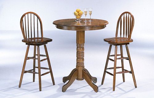 An ornately carved, oak finish bar table and stool set makes a lovely addition to your home. Its styling lends itself to an Early American decor. The table has a round top with a simple apron. The large turned base has a four leg support which adds its sturdy construction. The bar stools featured have a Windsor style with arrow back supports and a swivel seat, with a ball bearing mechanism. The price quoted is for the table and two bar stools. Table:36" Accessories not included. Table 36" D Chairs 29"H *Some Assembly Required